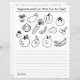 Feuille de travail sur 2 côtés. Le premier côté comporte des illustrations de divers légumes et fruits, ainsi qu'un espace où l'élève peut écrire les noms des articles qu'il peut identifier. Ils peuvent également colorier les illustrations. Sur le deuxième côté, les écoliers sont invités à dessiner leurs propres légumes et fruits.