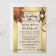 Invitation de mariage romantique et élégante avec des feuilles d'automne colorées sur un arrière - plan en bois clair patiné avec des panneaux métalliques or et une lanterne festive avec des tourbillons floraux. Le petit ornement stylisé en haut au milieu est une image séparée et peut être traîné ou supprimé si vous le souhaitez.