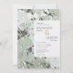 Ces invitations de mariage de 5 po x 7 po présentent un motif abstrait de feuilles dans des tons de sauge poussiéreux, d'algues et de brumeux avec des espaces réservés, "Avec leurs familles, veuillez vous joindre", les prénoms et prénoms de mariée et mariée, "pour leur mariage", date, heure, nom et adresse du mariage, "accueil à suivre".