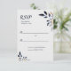 Feuilles bleus avec carte RSVP de mariage or conçu avec des feuilles délicats et doux dans les tons foncés marine, bleu clair et des accents de tons or. Le texte comprend : RSVP, Répondre par date et espace pour que les invités puissent ajouter leur nom. Pour personnaliser, insérez simplement votre réponse par date dans notre modèle facile, en remplaçant l'exemple de texte. Assurez-vous de voir l'ensemble des Feuilles bleus avec Gold Mariage Collection pour les pièces correspondantes.