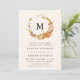 Invitations mariages de automne élégantes et rustiques avec une couronne de feuilles et branches d'automne chaudes entourant votre monogramme personnalisé et les détails de votre mariage affichés ci-dessous. L'envers de l'invitation présente une couleur arrière - plan marron foncé contrastée.