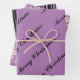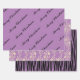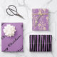Trois styles distincts de papier d'emballage violet stylisé. Le premier est une impression zèbre rayée noire audacieuse et exotique sur le violet le second est d'élégantes fleurs d'or et des feuilles en rangs en cascade sur une toile de fond violet et le dernier est en lettres noires légende de joyeux noël qui peut être personnalisé sur un fond violet. Vibes violettes modernes glam.
