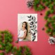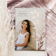 Le faire-part de graduation chic et moderne comprend une seule photo verticale/portrait en forme d'arche, avec des vignes d'escalade de feuilles botaniques roses en feuille d'or le long du côté droit. Personnalisez avec le nom de votre diplômé, l'année de cours et l'école et ajoutez un message personnel à l'arrière, ainsi qu'une photo supplémentaire.
