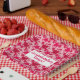 Feuilles d'érable rouges et blanches sur fond rose. (Fond de charbon de bois également disponible).