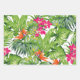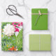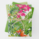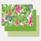Ensemble de papier d'emballage à trois feuilles. La feuille 1 est un design feuille vert tropical avec des fleurs rose et orange vifs. Les feuilles 2 et 3 coordonnent les feuilles vertes solides. Contactez-nous pour obtenir de l'aide sur la personnalisation ou pour demander des produits correspondants ou coordonnés.