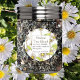A sticker for an herbal tea blend that you can customize for the specific herb that will be in your package or jar or leave the line blank so you can handwrite the herb on the sticker decorated with a border of feverfew flower handdrawn with ink and coloured pencil.