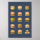 Made in Adobe Illustrator. Burgers are (from left to right): Egg, bleu, veggie, buffalo, classic, southwestern, ramen, teriyaki, bbq, bacon, kobe, mushroom + swiss, chili, double, sliders.