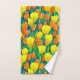 Towel set in a pattern of orange and yellow tulips and green leaves in a field