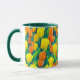 Mug in a pattern of orange and yellow tulips and green leaves in a field