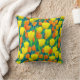 Throw pillow in a pattern of orange and yellow tulips and green leaves in a field