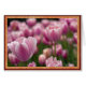 Colour photograph of a field of pink tulips. 7"x5". Decorative border. Blank.