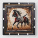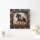 Bring the beauty of nature into your home with our stunning wooden wall clock featuring a majestic Paint horse trotting through a sunlit field. The clock is framed by a sleek ½-inch flat black wooden border, while the embedded wood showcases deep carvings and rugged burn marks in rich hues of red, grey, and black, creating a striking contrast against the lighter wood. This unique piece not only captures the essence of rustic charm but also offers the durability of non-wood materials, ensuring it remains a timeless addition to your decor.