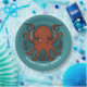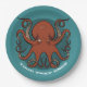 Paper plates with a nautical theme, featuring a cartoon of a rust red octopus with a mean frown, curling tentacles spread in all directions and fleshy coloured suckers exposed. A shoal of fish stream past in the background. For fans of octopuses and cephalopods with attitude. Personalize with a simple change to the editable text which curves around the image. Customize it to change the ocean green background colour which surrounds and shows through the semi-transparent background shape.