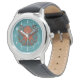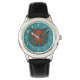 A kids' watch featuring a cartoon of a rust red octopus with a mean frown, curling tentacles spread in all directions and fleshy coloured suckers exposed. A shoal of fish stream past in the background. For fans of octopuses and cephalopods with attitude. Add your own legend with a simple change to the editable text which curves around the image. Customize your watch to change the ocean green background colour which surrounds and shows through the semi-transparent background shape.