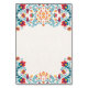 This Fiesta Colorful Botanical Floral Spanish Wedding Table Number design features an elegant floral arrangement that frames the top and bottom of the card with a symmetrical layout, bringing balance and a sense of formality to the composition. The flowers are stylized with bold colors like red, teal, and orange, complemented by intricate vines and small blossoms, creating a lively yet refined look. The central floral motif at the top serves as a focal point, while the surrounding details add a charming folk-art aesthetic that is both festive and sophisticated.