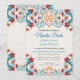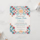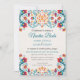 This Fiesta Colourful Botanical Floral Spanish Wedding Invitation design features an elegant floral arrangement that frames the top and bottom of the card with a symmetrical layout, bringing balance and a sense of formality to the composition. The flowers are stylized with bold colours like red, teal, and orange, complemented by intricate vines and small blossoms, creating a lively yet refined look. The central floral motif at the top serves as a focal point, while the surrounding details add a charming folk-art aesthetic that is both festive and sophisticated.