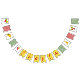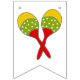 Colourful Fiesta themed party flag banner done in the colours red, yellow, green and white. Graphics of maracas, taco, bottle of tequila, chili peppers and oaxaca style pattern. Fiesta in large red lettering decorate the middle yellow flags.