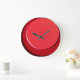Retro modern red wall clock in a crescent moon shape with a iridescent red grid pattern on the inside.