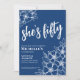 Elegant Fifty Blue 50th Birthday Party Invitation. A fun but elegant 50th birthday party invitation with girly blue and white flowers for the young at heart. A playful flower pattern frames a script typography "she's fifty" mixed with a more classic serif font. Celebrate fifty years of life with this beautiful botanical design. The fun part is you can change out ALL of the colours!! You can not only change the background colours and font, but you can change the lines for the flowers as well.