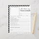 A fun teacher appreciation gift at the end of the school year to give a teacher thanks. This an all about my teacher fill in the blank letter with space for your child to write by hand and a blank arrow box to write or draw something in. The back of this teacher letter gift is a striped white and black. This would make a cute teacher keepsake. Please take a look at my teacher gift collection for more ideas.