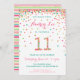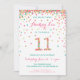 Fêtez l'anniversaire de votre 11 ans avec de l'or coloré, du rose, de la menthe et des confettis turquoises sur ces invitations à l'anniversaire de votre 11e anniversaire ! Avec les détails de la fête de votre fille et un "11" en confetti. Ce design adorable est super mignon et girly.