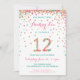 Fêtez l'anniversaire de votre 12 ans avec de l'or coloré, du rose, de la menthe et des confettis turquoises sur ces invitations à l'anniversaire de votre 12e anniversaire ! Avec les détails de la fête de votre fille et le numéro "12" en confetti. Ce design adorable est super mignon et girly.