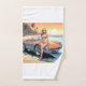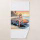 Portrait moderne d'une charmante fille, avec une voiture de sport, dans un magnifique paysage de mer et de plage, avec des couleurs chaudes au coucher du soleil. Graphique informatique