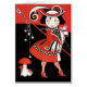 Dessin noir, rouge et blanc d'une petite fille regardant par-dessus son épaule portant un manteau rouge, des bas de filet de pêche, des talons hauts et un casquette fantaisiste. Dessin du caricaturiste italien Antonio Rubino pour la couverture du magazine pour enfants "Il giornalino della Domenica", 1909.