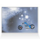 Une fille blonde se trouvant à travers une motocyclette de couperet avec des étoiles et des nuages à l'arrière-plan.