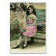 Carte postale démodée colorée d'une fille s'asseyant sur un banc avec des fleurs sauvages dans un panier et un bouquet.