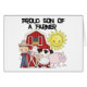 Le fils fier d'un agriculteur aimera ce T-shirts du fils de l'agriculteur mignon, combinaisons, tasses, cartes, boutons, autocollants, sacs fourre-tout, et d'autres articles comportant un agriculteur, une grange rouge de foin, une vache, un porc, des moutons, et un soleil de sourire !