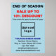 Poster que vous pouvez utiliser comme matériel de marketing pour votre entreprise afin d'attirer plus de clients à chaque fin de saison. Affiche personnalisable avec vente de fin de saison, votre nom d'entreprise et d'autres informations. Customisez-le et utilisez-le pour convaincre plus de clients d'acheter vos produits ou clients d'aimer vos services cette fin de saison. Les couleurs et la forme du design sont des textes noirs, bleus foncés et rouges sur un arrière - plan bleu clair et un format de portrait rectangle forme. Le contenu est la fin de saison, la vente, le pourcentage de remise que vous offrirez, les dates de vente, votre nom d'entreprise, logo, adresse, numéro de téléphone, e-mail et site Web ou votre page de médias sociaux. Veuillez vérifier l'apparence après avoir téléchargé le logo et tapé des textes. Si l'apparence vous plaît, vous pouvez passer votre commande maintenant. Si vous avez besoin de redimensionner et déplacer le logo et les textes pour s'adapter à cette affiche ou à d'autres dimensions, formes et styles appropriés que vous choisirez, veuillez modifier l'outil de conception. Vous pouvez également effectuer d'autres modifications dans l'outil de conception en fonction de l'apparence de cette affiche que vous préférez, comme changer la couleur arrière - plan, la couleur de police et le style de police. Je vous souhaite plus de ventes cette fin de saison et toutes les saisons.