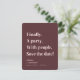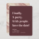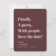 Finally a Party Simple Text Marsala Wine Minimalist Save the Date. A modern simple design highlights this colour editable typography! Finally. A party. With people. Save the Date! With a pretty marble texture on back side, but can be replaced by your own photo.