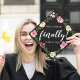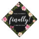 Cute personalized grad cap topper features your school and class year with "finally!" in the centre, in white brush script lettering on a black background adorned with pink watercolor flowers and green foliage.