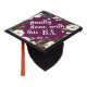 Cute and funny grad cap topper features the quote "Finally done with this B.S" (we mean Bachelor of Science! *wink wink*) in white brush script lettering on a vibrant plum purple background adorned with white watercolor flowers and green foliage. Personalize with your class year and/or school.