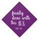 Cute and funny grad cap topper features the quote "Finally done with this B.S" (we mean Bachelor of Science! *wink wink*) in white brush script lettering on a vibrant plum purple background. Personalize with your class year and/or school.