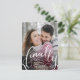 This save the date postcard is for couples who have dated or been engaged for a long time and are finally getting married. Hand lettered "finally" elegantly swoops along the bottom half of the card.