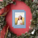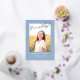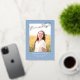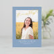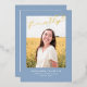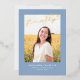 This stylish graduation announcement and invitation features a single photo with the word finally in gold foil above it on a dusty blue background. The back of the card can be used for an invitation or a personal message.