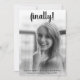 Modern graduation party invitation featuring "finally" in a thick black script handwriting along with the graduate's name and school info over your favourite vertical photo. The backside has your party details in black over a white background. A simple design that makes your photo the main feature. This design works for a boy or a girl graduate.