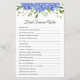 This Find Someone Who game sheet will bring a lot of fun and laughter to your event! It will cause your guests to get up and get to know one another as they try to find someone to fit into each of the categories. This game is no simple task and your guests will have a blast playing it! You'll be shocked at what you learn about one another. The page is beautiful with multi-hued blue hydrangeas, natural greenery, and matching blue striped back.