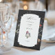 This chic welcome pedestal sign features an 18th century Dutch floral still life, including white, red and gold tulips and wildflowers on a black background with custom centre label, complementary floral graphics and elegant flowing custom calligraphy.