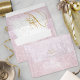 A watercolor background in shades from soft lavender to mauve is used to create the pieces of this beautiful wedding suite. The coordinating wedding envelope shown here also features a beautiful gradient interior topped by an abstract of fine gold lines and glittering lighting effects. Easily add your own names and return address using the provided template. Search ID867 to see other pieces and colour choices for this set.