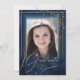 A watercolor background in shades from royal blue to navy is topped by an abstract of fine gold lines and glittering lighting effects to create this beautiful graduation invitation. The card also features elegant calligraphy and a gradient frame to hold your photo. Easily add your own personal event details using the provided template. Search ID867 to see other pieces and color choices for this set.