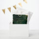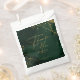 A watercolor background in shades of emerald green is topped by an abstract of fine gold lines and glittering lighting effects to create the pieces of this beautiful wedding suite. The wedding favour bag shown here also features 'Thank You' calligraphy and a personal message along with the bride and groom's names and wedding date. Search ID867 to see other pieces and colour choices for this set.