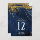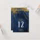 A watercolor background in shades from royal blue to navy is topped by an abstract of fine gold lines and glittering lighting effects to create the pieces of this beautiful wedding suite. The wedding table number card shown here also features elegant calligraphy and a template to easily add your own names, wedding date and table numbers. Search ID867 to see other pieces and colour choices for this set.