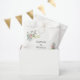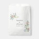 This exquisite favour bag is adorned with an elegant floral motif featuring delicate roses and hydrangeas nestled among lush green leaves.
