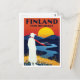 Celebrate the beauty of the Finnish landscape with this striking, vintage-style travel postcard. The highly graphic illustration features a figure standing by a winding blue river, gazing toward a huge yellow sun setting over the blue mountains. The bold, contrasting color palette evokes the "Midnight Sun" of the Finnish summer. The clear, retro lettering reads "FINNLAND FOR HOLIDAYS". This card is ideal for fans of Scandinavian design, collecting retro travel posters, or anyone sending a unique greeting from this beautiful Nordic country.