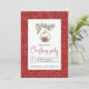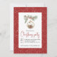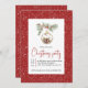 Fir branc with Christmas ornament party Invitation. It features a Christmas ornament with a pine cone and a branch of fir. There is a red border around it with white snowflakes.