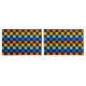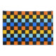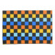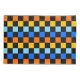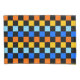 A vibrant chequerboard pattern featuring alternating rows of orange, yellow, light blue, and blue squares against a black background. The design is bold and energetic.