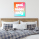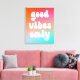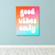 A groovy retro "good vibes only" typography design on a vivid orange, hot pink and aqua blue gradient on 16x20 wrapped canvas wall art.